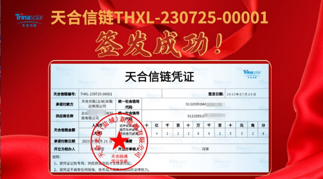 系统上线之际,光伏行业首笔天合信链数字凭证正式发布,这一里程碑式的行业首创,穿透式解决了光伏行业上下游中小企业生态内的数字信用难题。“天合信链”基于核心企业真实业务背景签发,具有可拆分、可流转、可融资的优势,实现审批线上化、自动化、智能化,也为整个光伏行业供应链金融生态圈发展提供了更多的安全性、公正性与流通性。