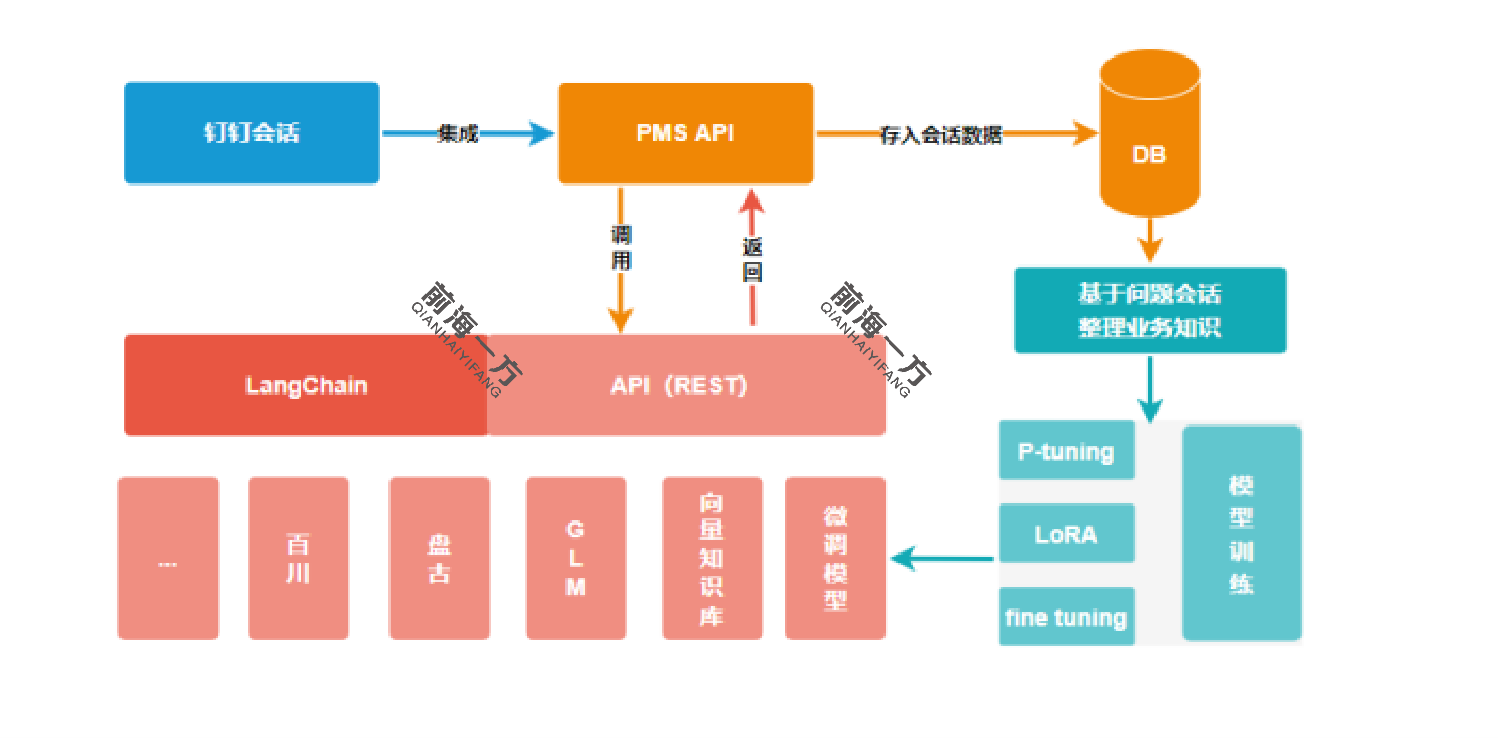 基于公司的文档资料等,建立公司的知识库,向部分员工开放问答功能,目前已实现LLM到钉钉的集成,并通过公司PMS系统实现问答信息管理和记录。以支持未来对问答进行分析,提炼微调样本来逐步提升模型能力。架构示意图如下: