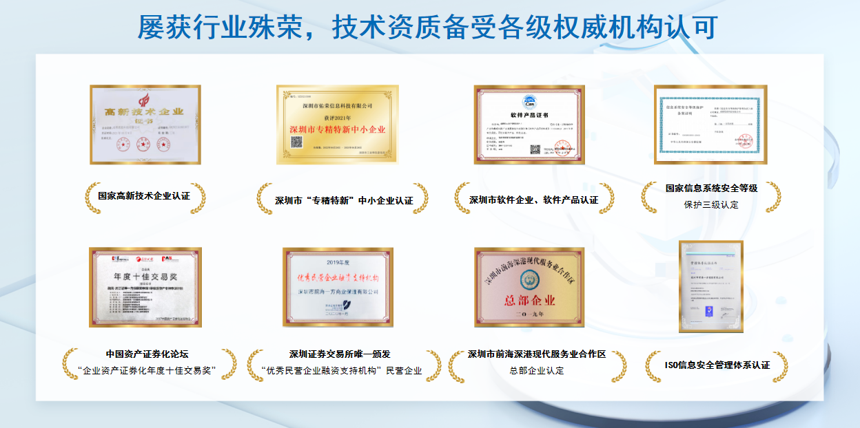 作为一家数字化为导向、科技驱动的高新技术企业,佑荣科技自成立以来,始终坚持科技创新和自主研发。公司汇聚了行业领先的技术专家和优秀人才,持续加大科研投入,积极探索前沿技术,不断推动产品和服务升级。经过多年的努力,佑荣科技已经在数字供应链金融服务领域取得了丰硕的成果,为众多企业提供了高效、便捷、稳健的产品与解决方案服务,助力企业实现在产业链供应链转型浪潮中的关键升级。