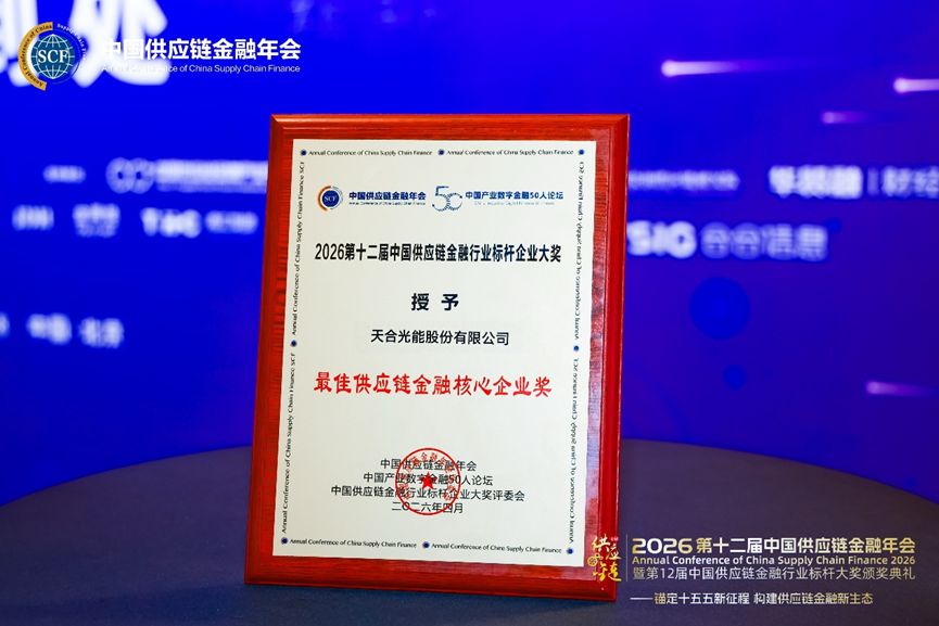 近日,2026第十二届中国供应链金融年会暨第十二届中国供应链金融行业标杆大奖颁奖典礼在北京隆重举行。中国银行原副行长,中国交易银行50人论坛主席张燕玲,国家金融监督管理总局政策研究局原一级巡视员叶燕斐、以及中国互联网金融协会业务一部副主任陈勇等重要嘉宾参会并发表重要讲话。我司战略合作伙伴--天合光能股份有限公司(以下简称“天合光能”)凭借在供应链金融领域的卓越创新实践与产业链赋能成效,从近60家参评机构中脱颖而出,荣膺"最佳供应链金融核心企业奖"。行业权威认可 标杆实力彰显