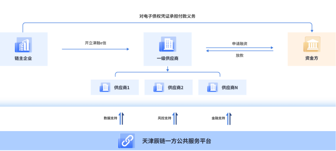 根据国家《关于规范供应链金融业务引导供应链信息服务机构更好服务中小企业融资有关事宜的通知》(银发〔2025〕77 号)精神及《中国互联网金融协会应收账款电子凭证业务自律管理规范》等七项自律规则,结合天津市《关于金融支持天津高质量发展的意见》“推动金融与数字技术深度融合,促进金融业转型升级,提升服务实体经济质效”、《天津市金融业发展“十四五”规划》“提升供应链金融服务能级”等重要战略部署,元旸科技与天津市北辰区政府深度合作,运用“科技金融”与“数字金融”手段,建设“规范、协同、科技驱动”的本地化供应链金融公共服务平台——天津辰链一方公共服务平台。平台力求精准把握《关于金融支持天津市重点产业链高质量发展的若干措施》中“提升金融服务线上化水平”的宝贵机遇,深化产业链数字化转型,赋能京津冀区域发展新动能。一、立足北辰、服务天津、辐射京津冀