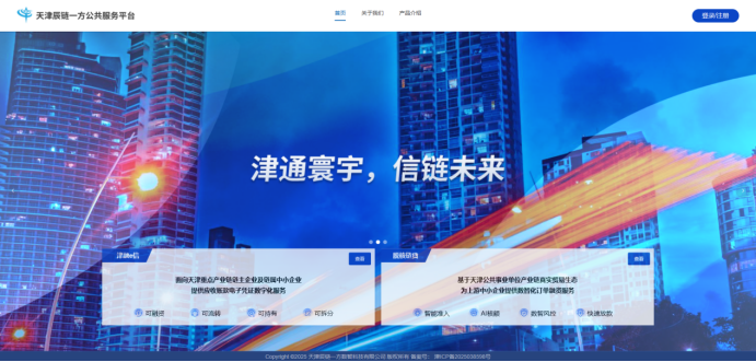 天津辰链一方公共服务平台以科技为引擎,推动金融服务线上化、智能化。平台已通过国家网络安全等级保护三级认证,具备完善的数据安全与风险防控能力。同时,平台已正式启动中国互联网金融协会自律备案工作,积极拥抱行业自律与合规发展,为企业和金融机构提供安全、合规、可信赖的数字化服务生态。平台的核心产品推出的应收账款电子凭证产品,主要围绕重点产业链真实贸易生态,为重点核心企业及链上中小企业提供标准化供应链金融服务。平台提供全程风控、运营支持与数据服务,并由合作银行完成最终放款,实现资金高效触达产业链生态。