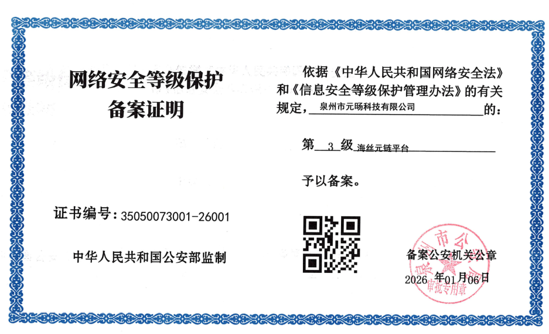 近日,公司传来重磅喜讯——新建平台“海丝元链”历经多轮严苛审核与全面测评,成功通过国家信息安全等级保护三级备案认证。这一成果不仅标志着“海丝元链”在信息安全防护、数据合规管理、业务流程风控等核心领域,已完全达到国家重要信息系统的安全标准,更充分彰显了公司深耕前沿科技赛道的硬核实力,以及主动践行监管要求、坚守合规发展底线的责任担当。作为国家对非银行金融相关机构信息系统的核心安全认证之一,国家信息安全等级保护三级认证堪称行业安全合规的“硬核通行证”,其测评标准覆盖物理环境安全、网络通信安全、数据全生命周期安全、应急处置保障等全维度防护体系,对平台的技术架构稳定性、风险预警管控能力、安全管理制度完善度等均设定了极高门槛。“海丝元链”自搭建之初,便将合规安全理念深度融入平台研发全流程,组建由资深安全专家、技术骨干组成的专项团队,深耕安全体系建设。团队通过采用国密算法数据加密、智能入侵检测与防御、多地域异地灾备等多重前沿技术手段,构建起“预防-检测-响应-恢复”全链条安全防护网络,从根源上保障用户数据隐私与业务流程的安全性、完整性和可用性。此次顺利通过三级等保备案,绝非偶然,而是监管部门与权威认证机构对“海丝元链”安全合规能力的高度认可,更是公司长期以来技术研发积累与综合实力的有力佐证。从平台底层技术架构的自主研发,到全流程安全体系的搭建优化;从日常风险的精准预判,到突发状况的快速应急响应,每一个环节的精益求精,都源于公司对“科技赋能合规,安全驱动发展”核心理念的深刻理解,以及在技术创新与安全保障领域的持续大力投入。未来,公司将以此次备案通过为全新起点,持续加大技术研发投入,不断深化技术创新与安全防护体系升级,推动“海丝元链”在合规安全的坚实基础上,充分释放区块链、大数据等前沿技术优势,精准赋能相关业务场景的数字化转型。同时,公司将始终紧跟监管政策导向,坚守“科技向善、安全为基”的发展理念,持续为用户与合作伙伴提供更可靠、更高效、更优质的服务,为推动行业规范健康发展贡献科技力量。