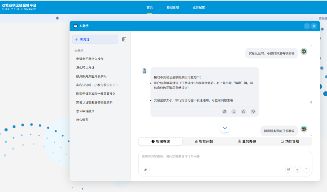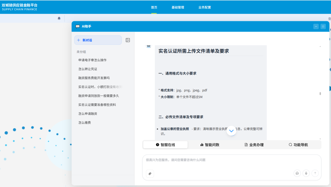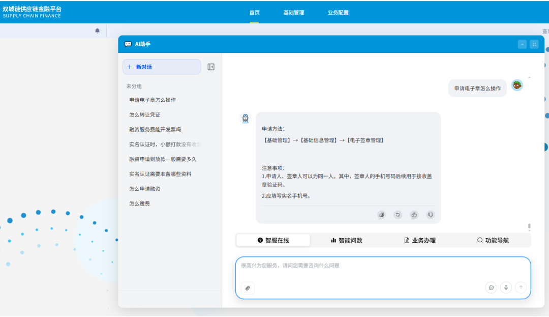 元旸科技自2019年开始引入OCR、NLP等智能辅助技术的应用,并于2023年开始研究探索LLM等AI技术在供应链金融中的应用,并已构建了多个内部辅助应用产品。经过了长期的的验证和技术测试,在2026年2月互金会备案认证的开局之年,元旸科技正式在链产品系统中启用了元旸AI智能助手,通过AI智能助手,可提供智能坐席、智能问数、智能操作引导等智慧辅助服务。核心价值与痛点解决:元旸AI智能助手作为自研的AI能力组件,可以便捷地引入到元旸既有“链”业务系统中,在业务系统的权限策略机制下,为系统用户提供智能化的问答、指引等智能服务。将有效地提升客户的服务效率,提升客户体验。技术亮点与功能:元旸AI智能助手采用独立的插件设计模式,业务系统通过组件引用,可“0”成本引入既有系统,并具备如下特性: