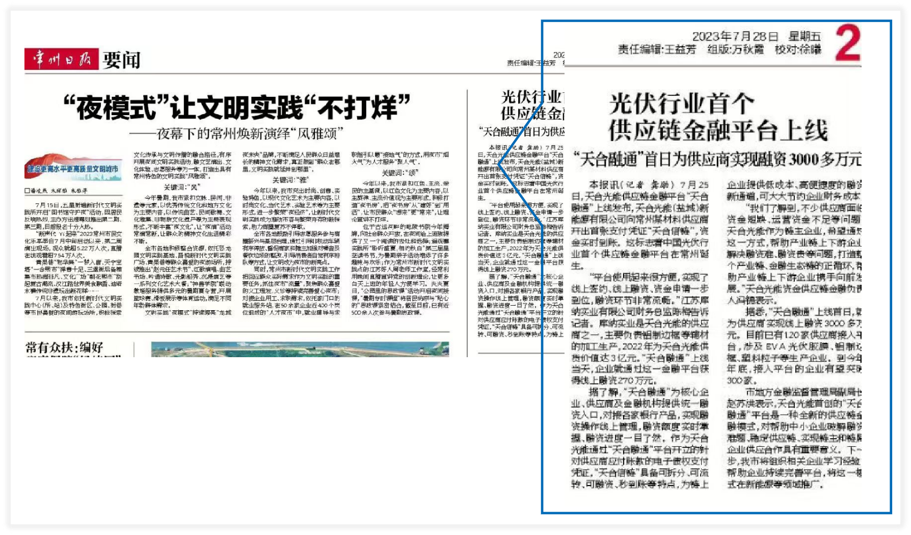 《常州日报》题为“光伏行业首个供应链金融平台上线”报道